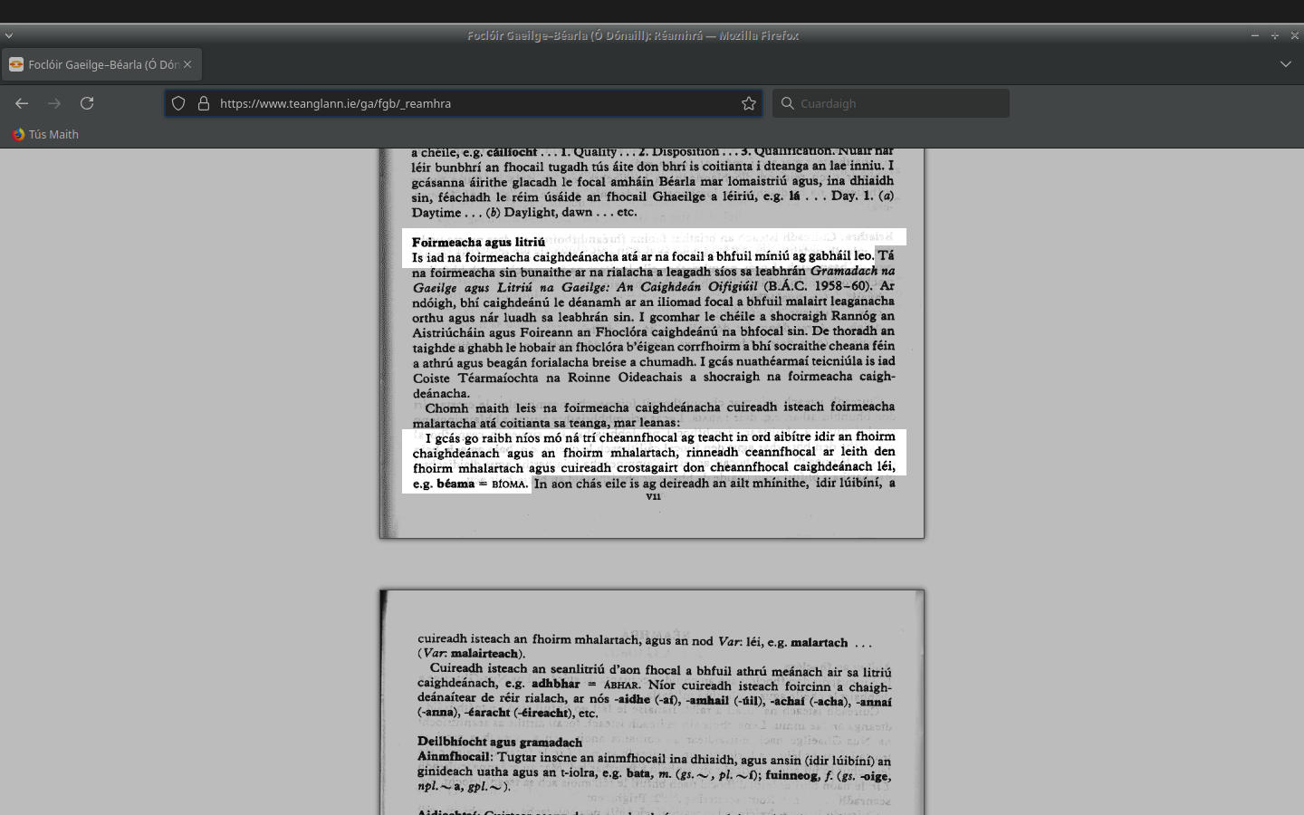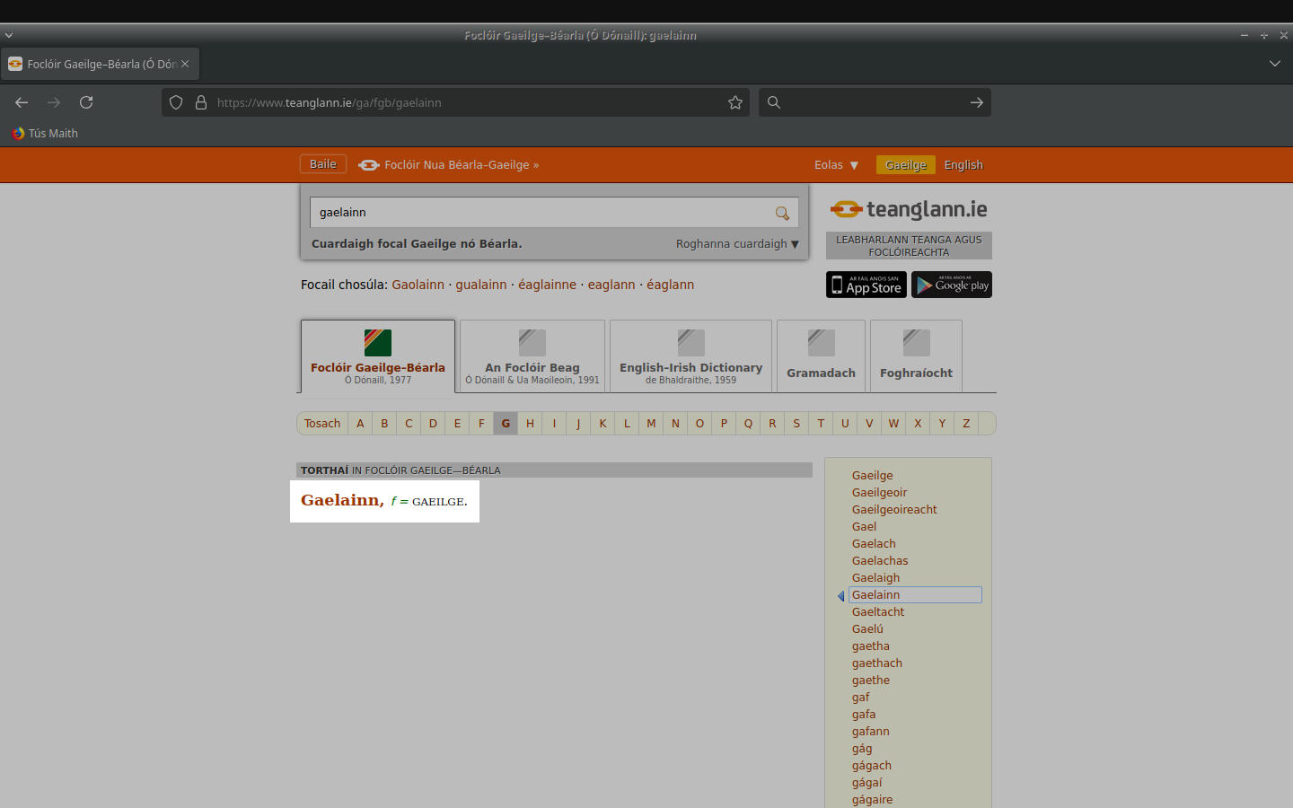 Ó Dónaill, N. (1977c). Foclóir Gaeilge‑Béarla. Ar líne: https://www.teanglann.ie/ga/fgb/gaelainn. Baile Átha Cliath:An Gúm. [Ceadaithe 20250201.]