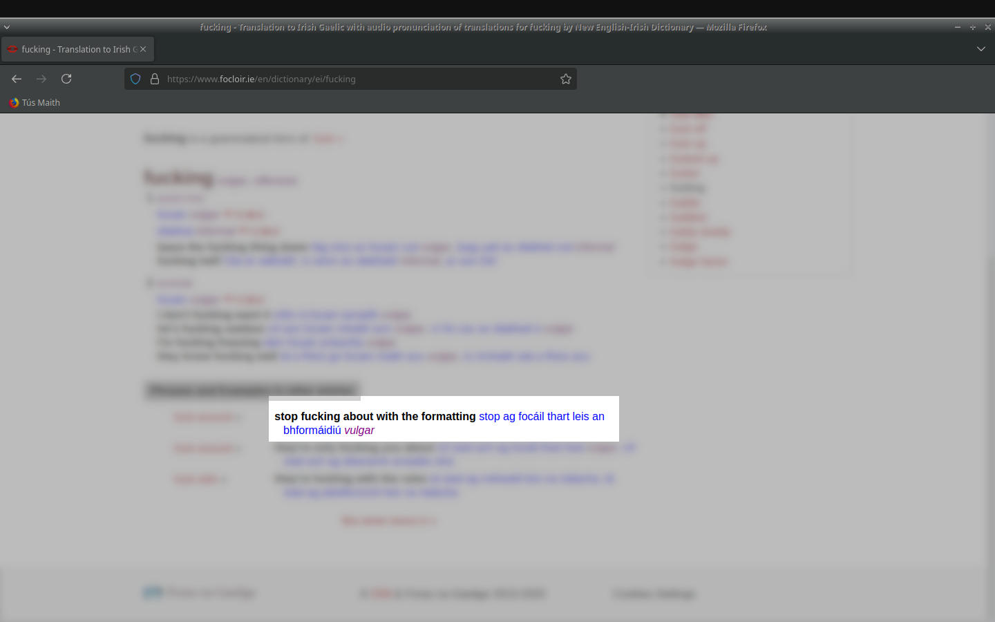 Ó Mianáin, P. (2020b). Concise English‑Irish Dictionary. Ar líne: https://www.focloir.ie/en/dictionary/ei/fucking. Baile Átha Cliath:An Gúm. [Ceadaithe 20250201.]