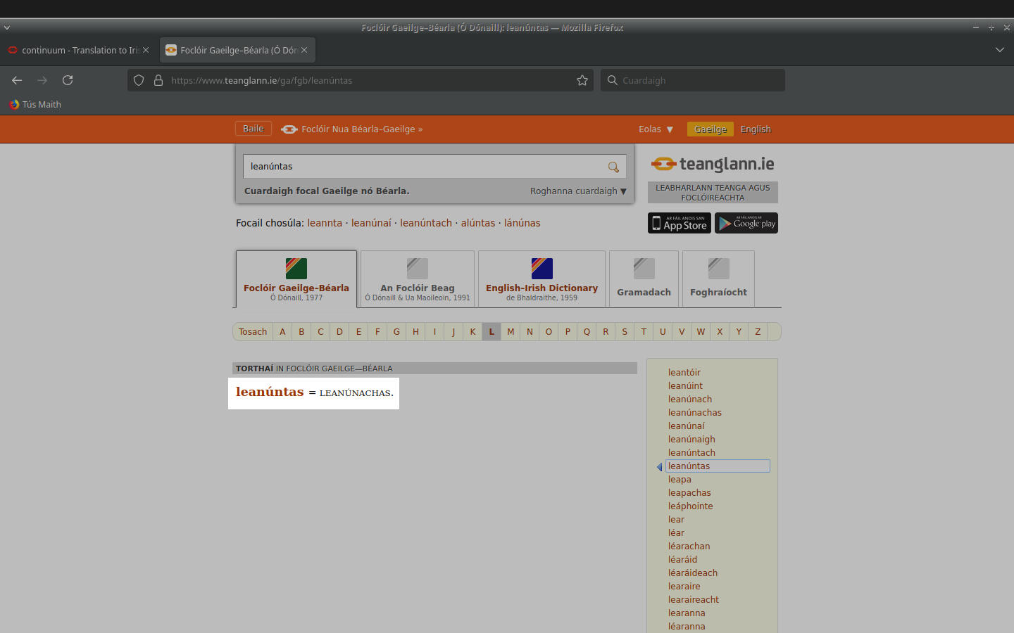Ó Dónaill, N. (1977b). Foclóir Gaeilge‑Béarla. Ar líne: https://www.teanglann.ie/ga/fgb/leanúntas. Baile Átha Cliath:An Gúm. [Ceadaithe 20250201.]