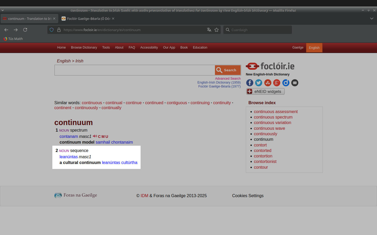 Ó Mianáin, P. (2020a). Concise English‑Irish Dictionary. Ar líne: https://www.focloir.ie/en/dictionary/ei/continuum. Baile Átha Cliath:An Gúm. [Ceadaithe 20250201.]